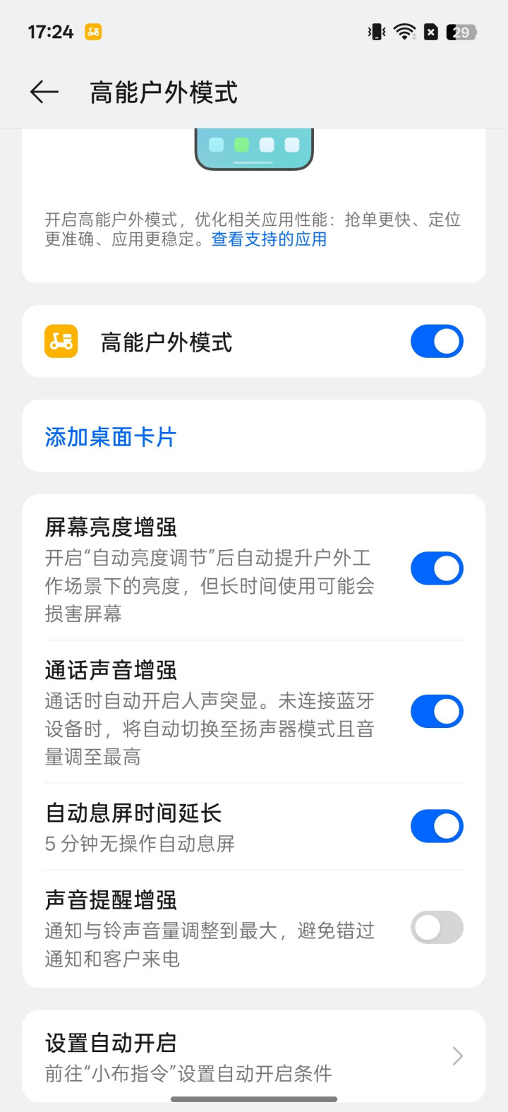 在设置中的「辅助功能」里,新增了一个「高能户外模式」,开启后屏幕亮度、通话声音、声音提醒都会有相应的增强,并且自动息屏时间也自动设置为5分钟。这个功能对于一些配送APP还有相应的优化,抢单更快、关联的配送APP保持后台不推出,进一步提升工作效率。