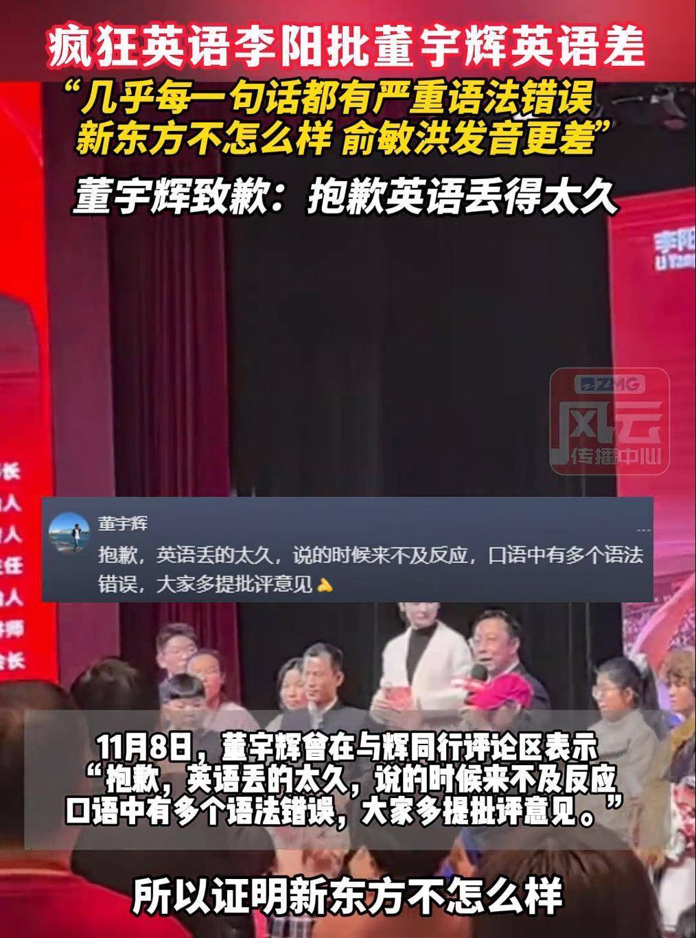 11月10日,有网友发视频,疯狂英语线下活动中,创始人李阳表示:“昨天我听了董宇辉的演讲,跟国外的外交官交流,几乎每一句话都有严重的语法错误,而且发音特别怪,所以证明新东方不怎么样,俞敏洪发音更差,所以学口语唯有疯狂英语。这段话一定要发到网上,引起洪天巨浪,轩然大波,我就喜欢轩然大波。”11月8日,董宇辉曾在“与辉同行”评论区表示:“抱歉,英语丢得太久,说的时候来不及反应,口语中有多个语法错误,大家多提批评意见。”(据11月14日纵览新闻)