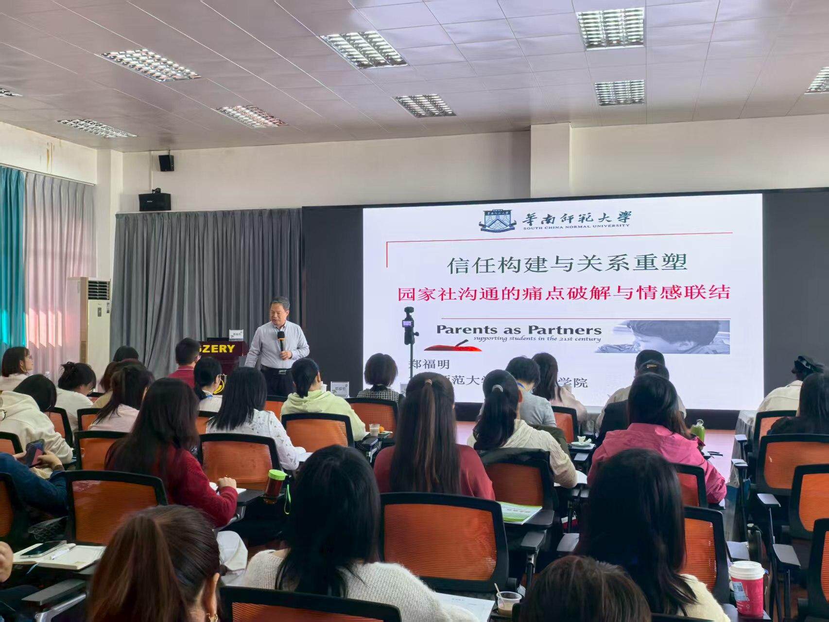 此外,华南师范大学教育科学学院教授郑福明以《信任构建与关系重塑:园家社沟通的痛点破解与情感联结》为题,从社会心理学与沟通艺术角度,深度剖析了协同育人中常见的信任危机与沟通障碍,如新生家长对幼儿园理念的认知差距、部分家庭因自身困境导致的育儿焦虑等,并提出通过专业引领、情感投入、机制创新来重建良性互动关系的策略,引发学员对育人“软环境”建设的深刻思考。